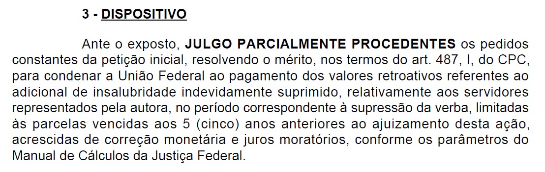 A sentença julgou parcialmente procedentes os pedidos formulados pela ANMP e determinou que a União restitua aos associados os valores retroativos do adicional de insalubridade, observada a prescrição quinquenal e os critérios de atualização definidos pelo Manual de Cálculos da Justiça Federal.