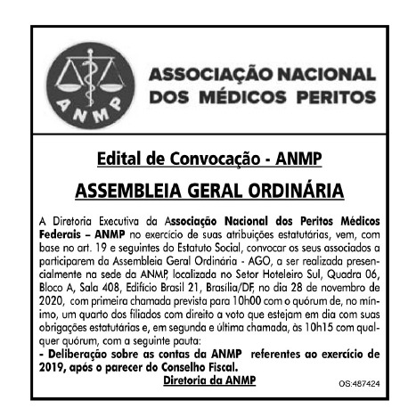 No último sábado (28/11), em atenção ao que determina o Estatuto Social da ANMP, foi realizada a Assembleia-Geral Ordinária de 2020 na sede da entidade, em Brasília/DF. Na ocasião, reuniram-se a Diretoria e o Conselho de Delegados da Associação para aprovar as contas de 2019 e para discutir sobre as atuais pautas de interesse da Carreira de Perícia Médica Federal.
