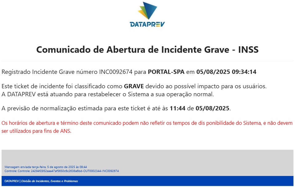 Na manhã desta terça-feira (05/08/2025), a DATAPREV registrou oficialmente a ocorrência de Incidente Grave nos sistemas essenciais ao trabalho da Perícia Médica Federal.
