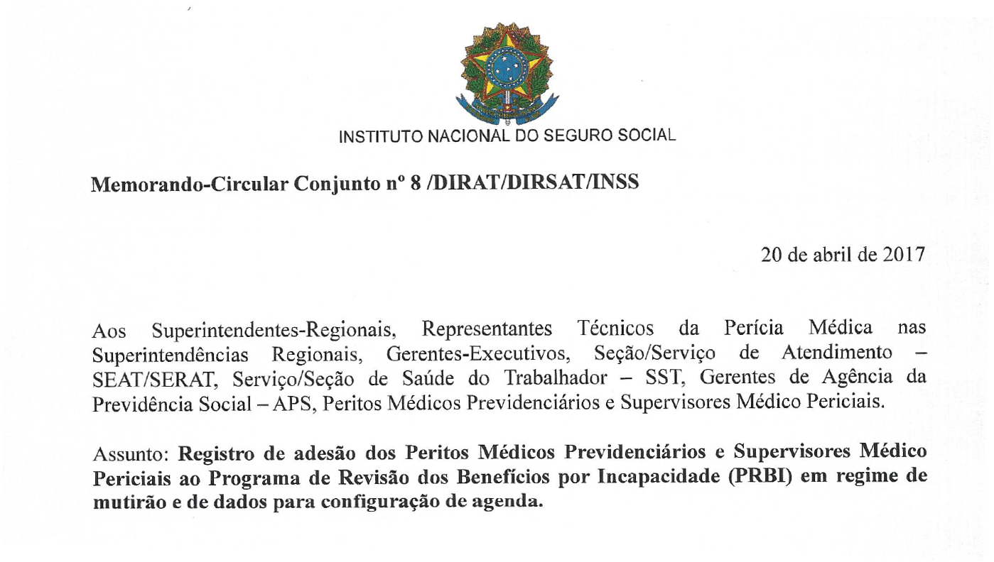 Na data de hoje foi publicado o Memorando-Circular-Conjunto nº8 DIRAT/DIRSAT/INSS que regulamenta o processo de realização das perícias revisionais do PRBI/BILD em regime de mutirão, conforme previsão da MP 767/17 e demais normas internas.