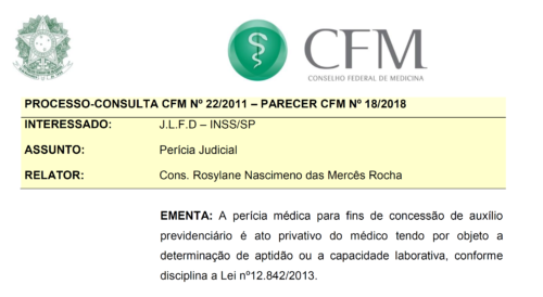 CFM Em resposta a consulta feita por Peritos Médicos Previdenciários sobre uma vara de Justiça que nomeou uma psicóloga para fazer laudos médicos periciais em ações