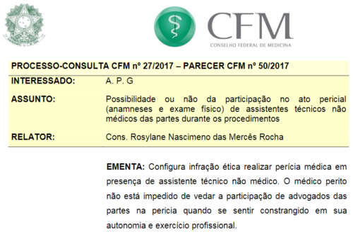 Decisão também permite ao Perito Médico proibir entrada de advogado nas perícias médicas O Conselho Federal de Medicina publicou na data de hoje (09/01/2018) o Parecer